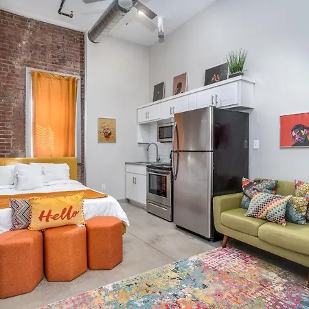 Less than 1 km from Rocky Mount city centre, The Davis Lofts At Main Street - Unit 3D Apartment features views of the street. The accommodation also includes a fully equipped kitchen with a microwave, a fridge, and kitchenware.